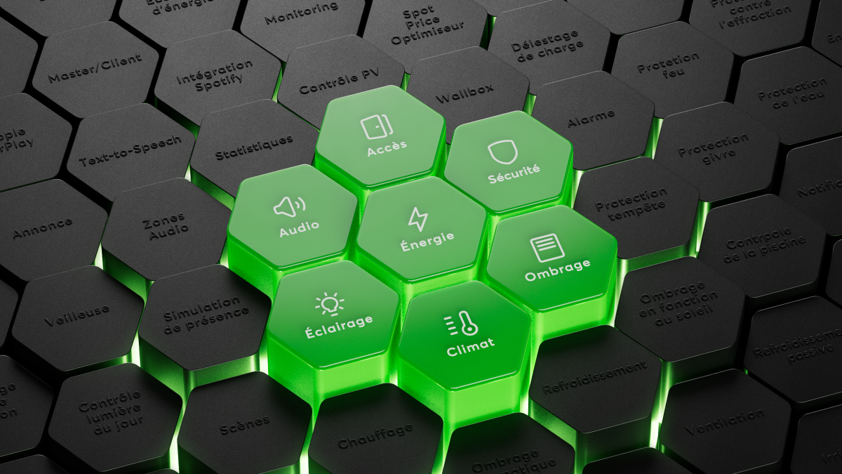 Grâce à la technologie Loxone, votre installation rassemble sous un même système toutes les fonctions de votre maison : éclairage, volets, chauffage, climatisation, sonorisation, sécurité, interphonie, contrôle d’accès, vidéosurveillance, énergie, piscine, jardin… le tout pilotable depuis une seule interface centralisée.